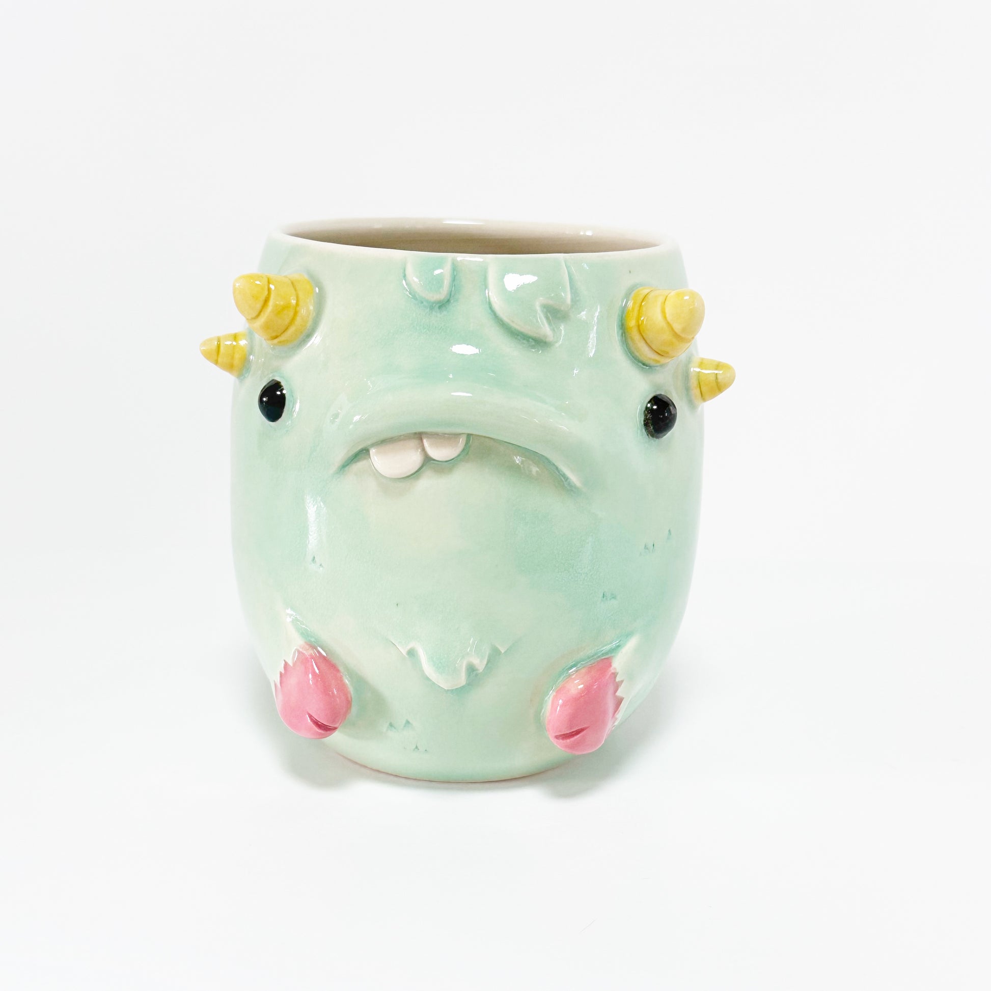 This mug is lovingly created on the wheel and then the features are built on by hand. Since all of our creations are built one at a time, no two are exactly the same. Our products are also hand painted adding to the unique design on every creation. You may be able to see our hands at work in the brush strokes of the glaze. You may also notice some texture in spots. This is part of our handmade quality and the uniqueness to every piece.
