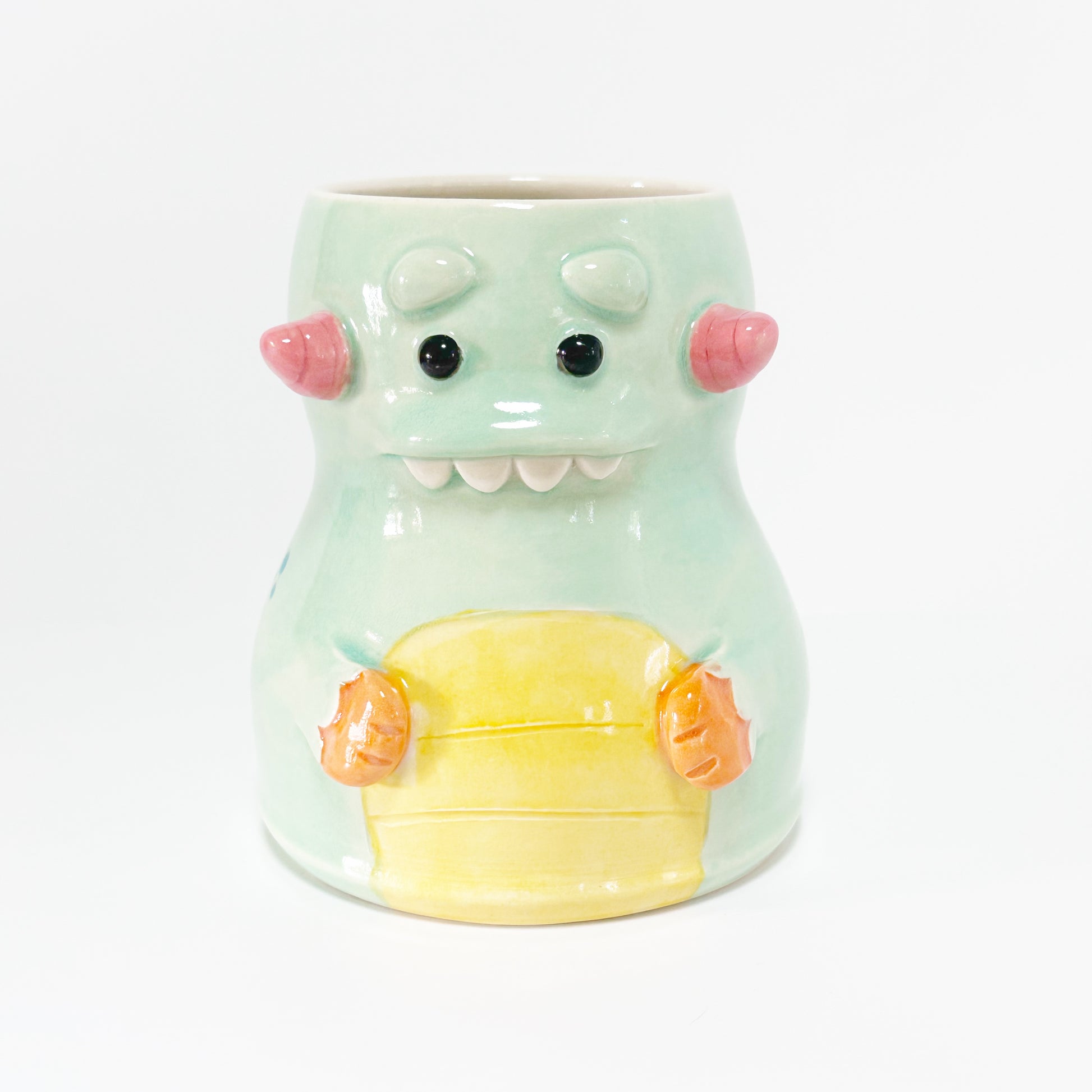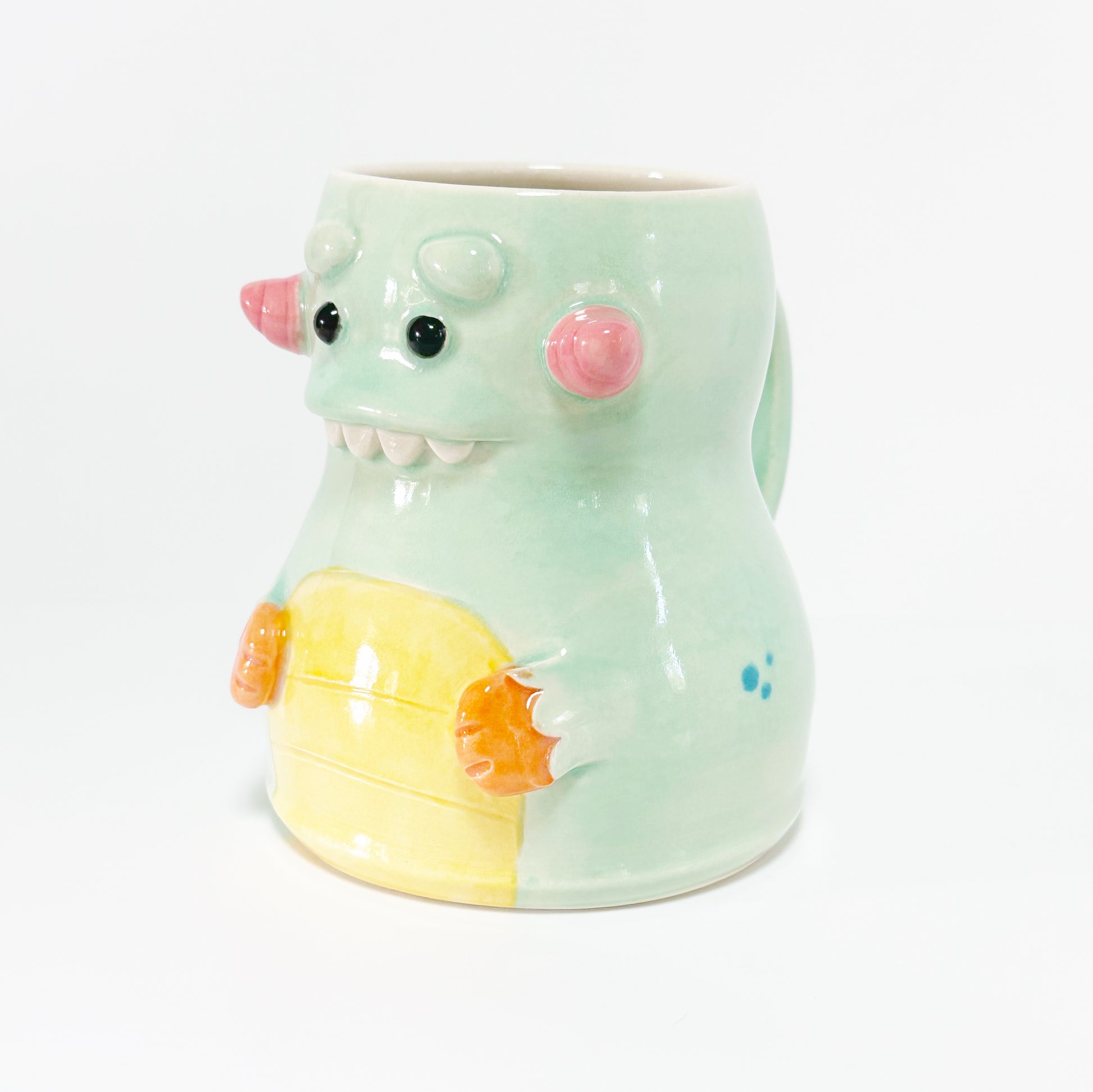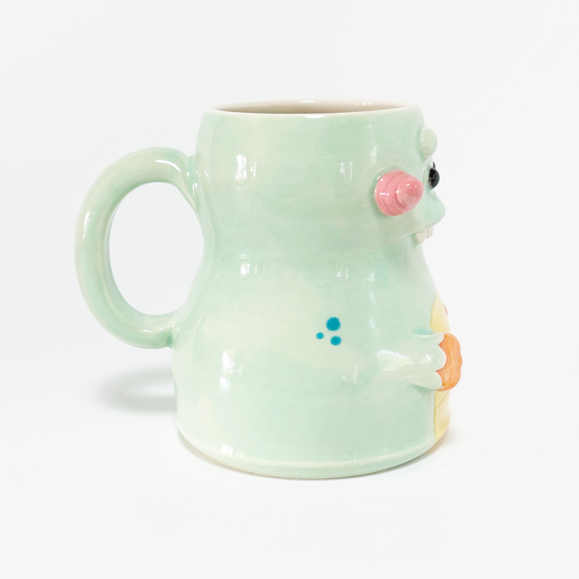 This mug is lovingly created on the wheel and then the features are built on by hand. Since all of our creations are built one at a time, no two are exactly the same. Our products are also hand painted adding to the unique design on every creation. You may be able to see our hands at work in the brush strokes of the glaze. You may also notice some texture in spots. This is part of our handmade quality and the uniqueness to every piece.