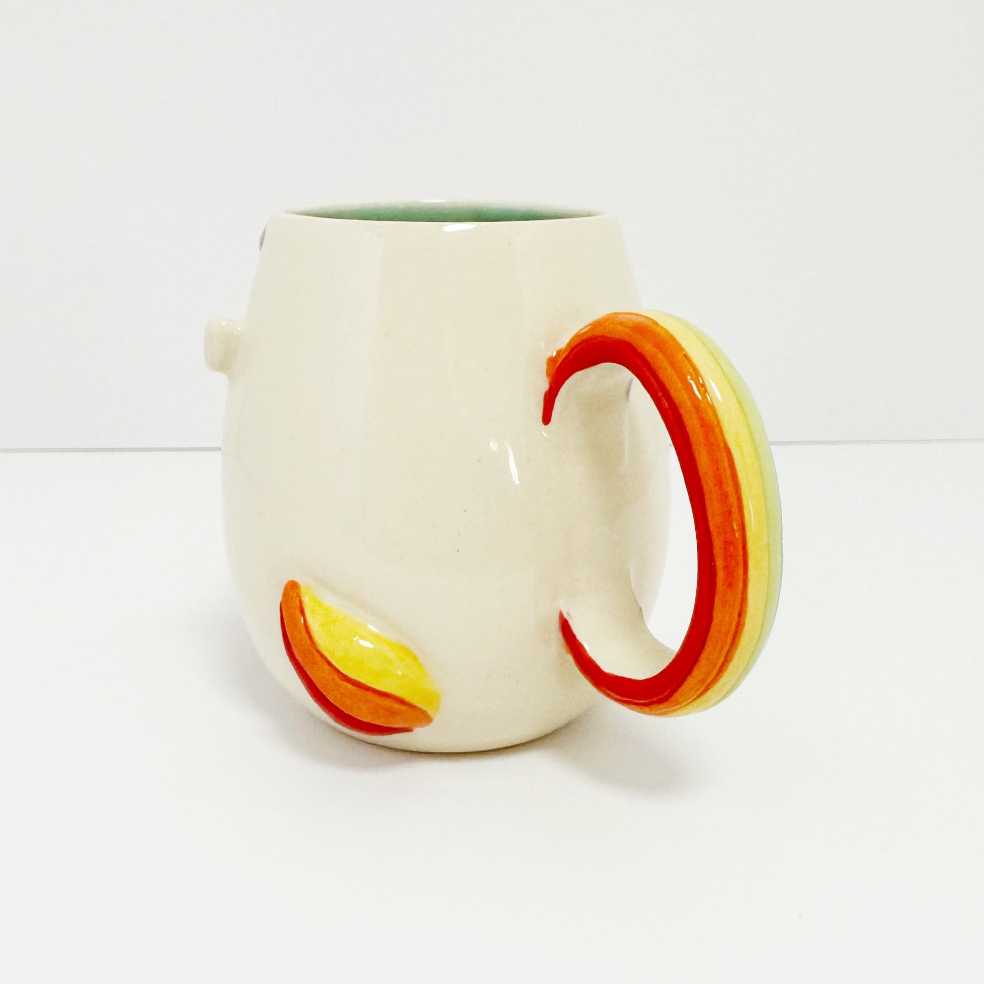 This mug is lovingly created on the wheel and then the features are built on by hand. Since all of our mugs are built one at a time, no two mugs are exactly the same. Our mugs are also hand painted adding to the unique design on every mug. You may be able to see our hands at work in the brush strokes of the glaze. You may also notice some texture in spots. This is part of our handmade quality and the uniqueness to every piece.
