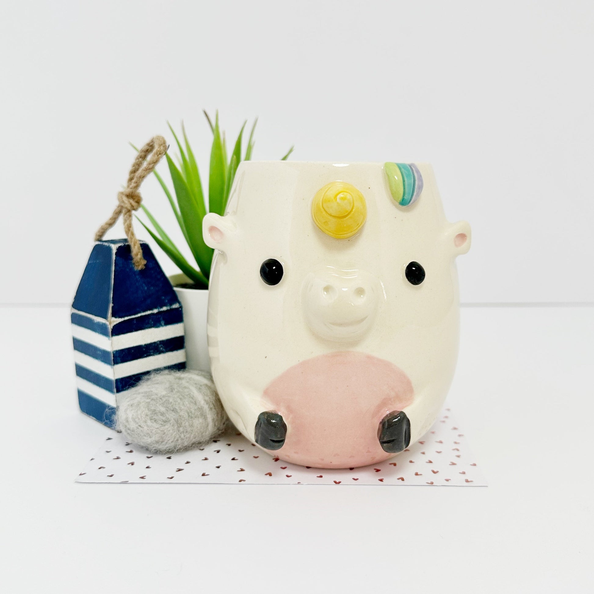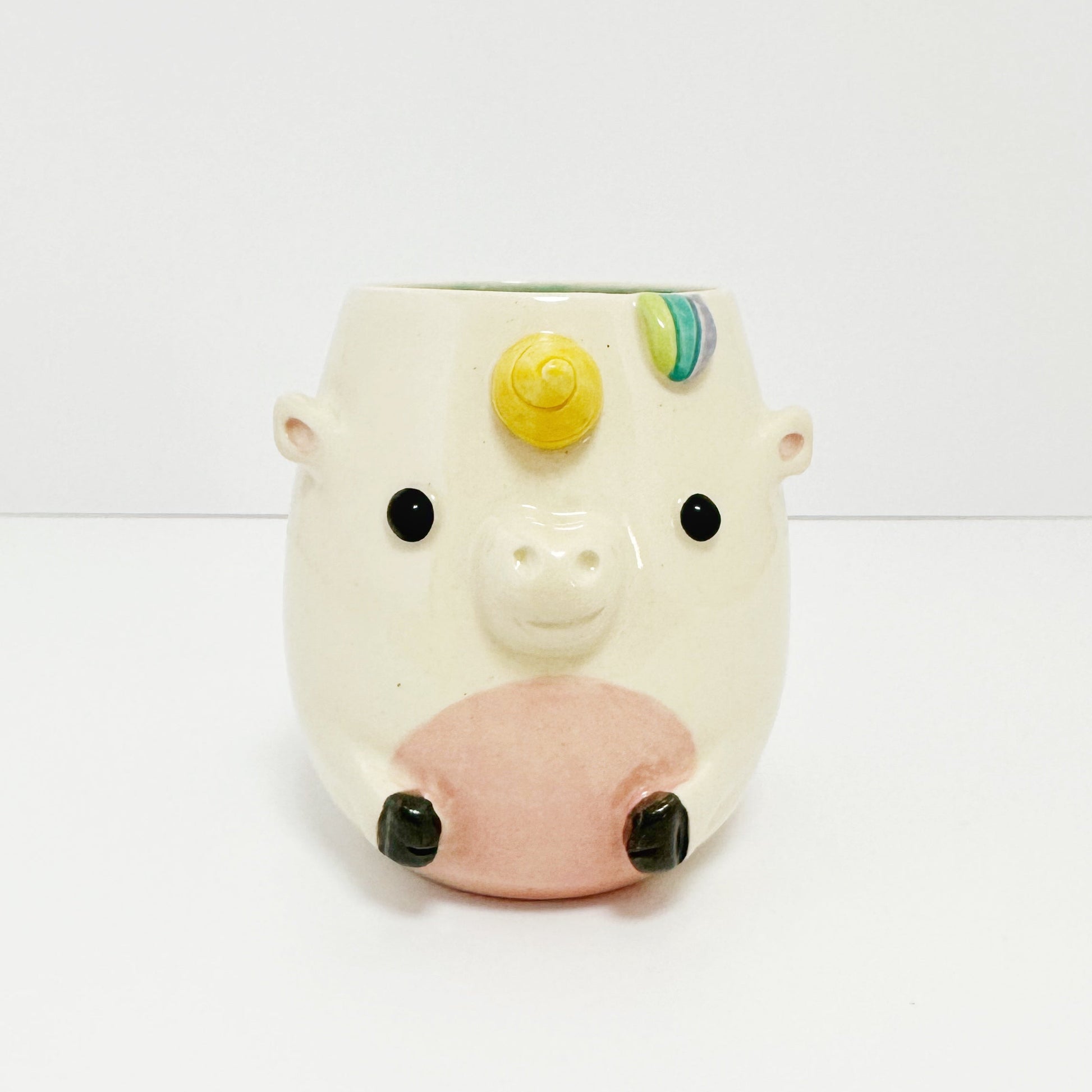 Tail, Bangs and Handle will be painted with a rainbow like our regular production unicorn. A coloured liner glaze will not be used for custom colour unicorns.