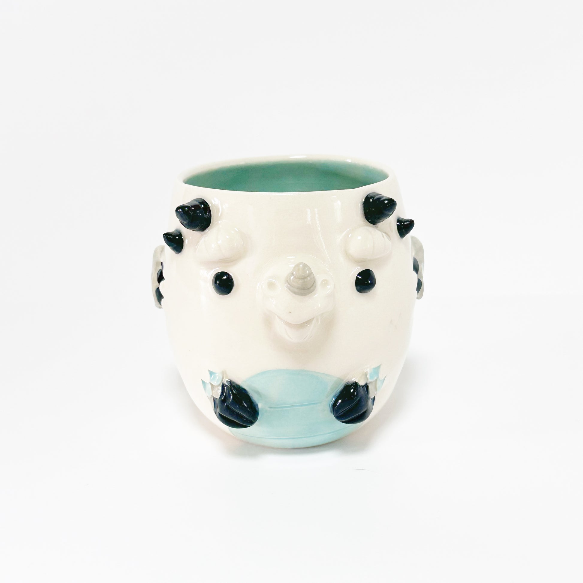 This mug is lovingly created on the wheel and then the features are built on by hand. Since all of our creations are built one at a time, no two are exactly the same. Our products are also hand painted adding to the unique design on every creation. You may be able to see our hands at work in the brush strokes of the glaze. You may also notice some texture in spots. This is part of our handmade quality and the uniqueness to every piece.