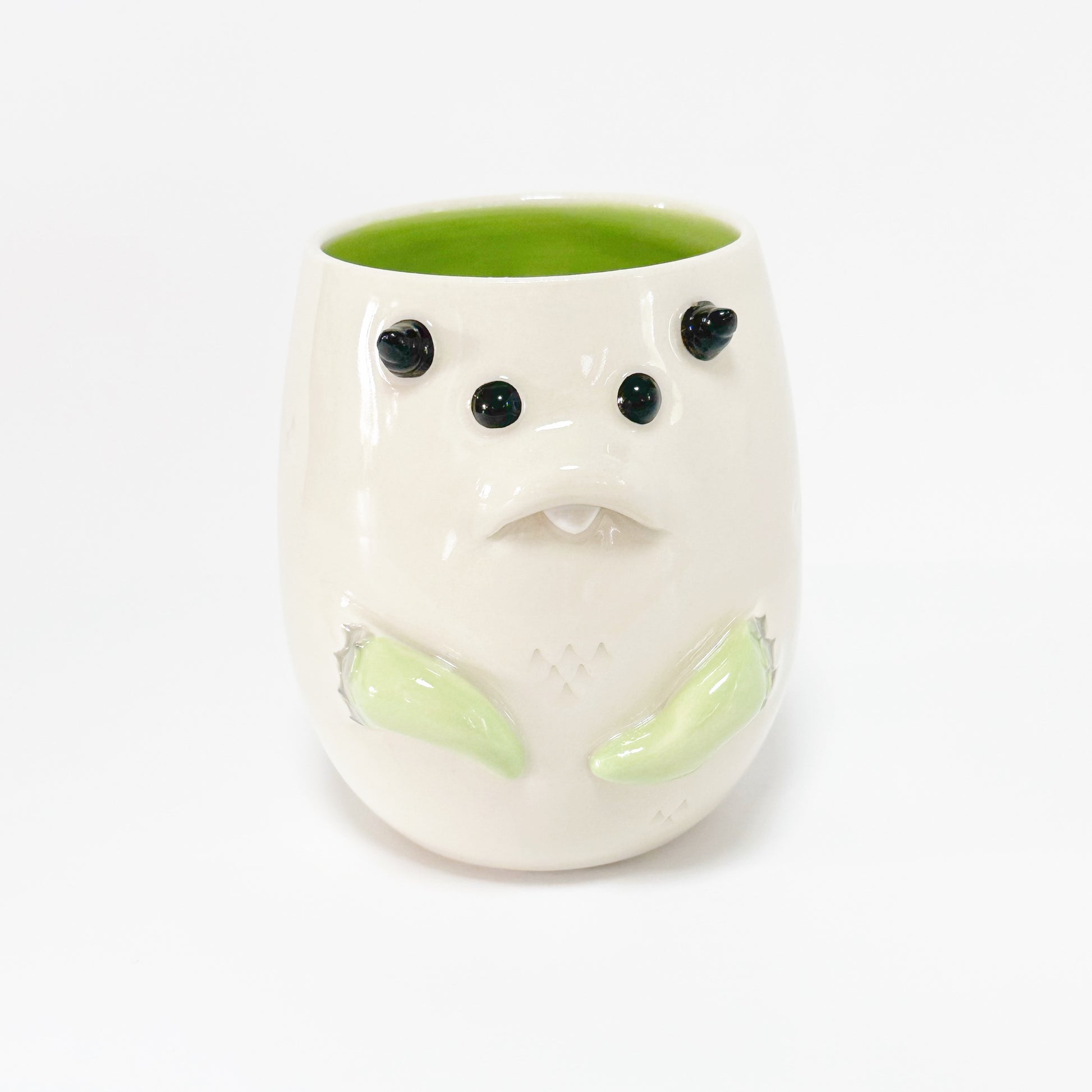 This mug is lovingly created on the wheel and then the features are built on by hand. Since all of our creations are built one at a time, no two are exactly the same. Our products are also hand painted adding to the unique design on every creation. You may be able to see our hands at work in the brush strokes of the glaze. You may also notice some texture in spots. This is part of our handmade quality and the uniqueness to every piece.
