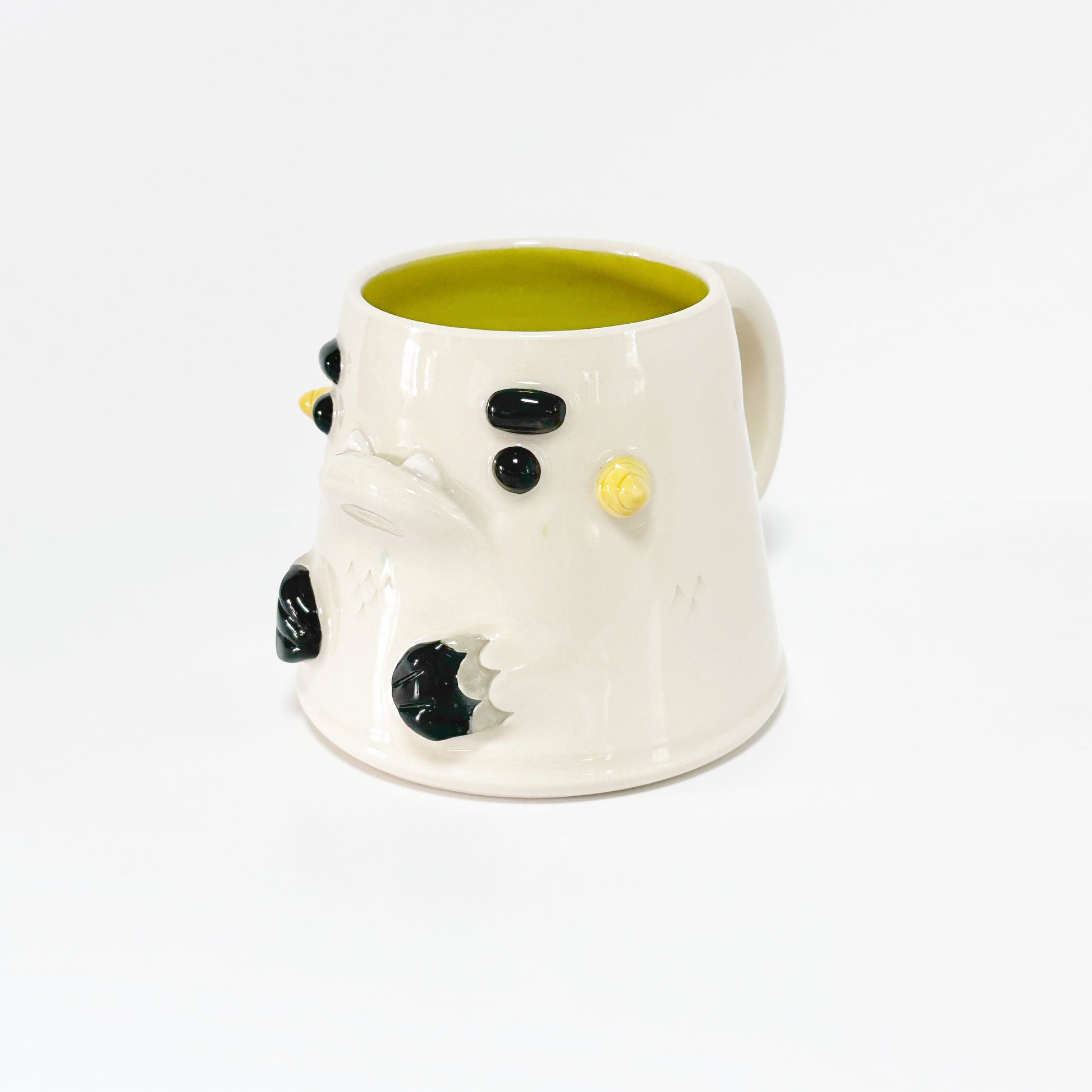 This mug is lovingly created on the wheel and then the features are built on by hand. Since all of our creations are built one at a time, no two are exactly the same. Our products are also hand painted adding to the unique design on every creation. You may be able to see our hands at work in the brush strokes of the glaze. You may also notice some texture in spots. This is part of our handmade quality and the uniqueness to every piece.