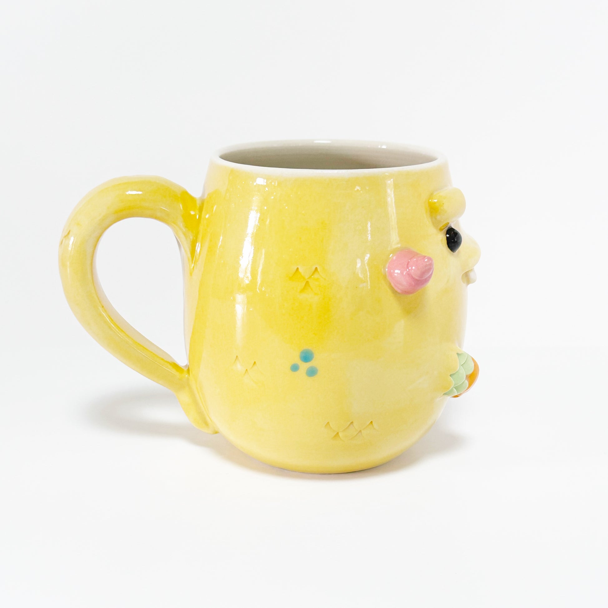 This mug is lovingly created on the wheel and then the features are built on by hand. Since all of our creations are built one at a time, no two are exactly the same. Our products are also hand painted adding to the unique design on every creation. You may be able to see our hands at work in the brush strokes of the glaze. You may also notice some texture in spots. This is part of our handmade quality and the uniqueness to every piece.