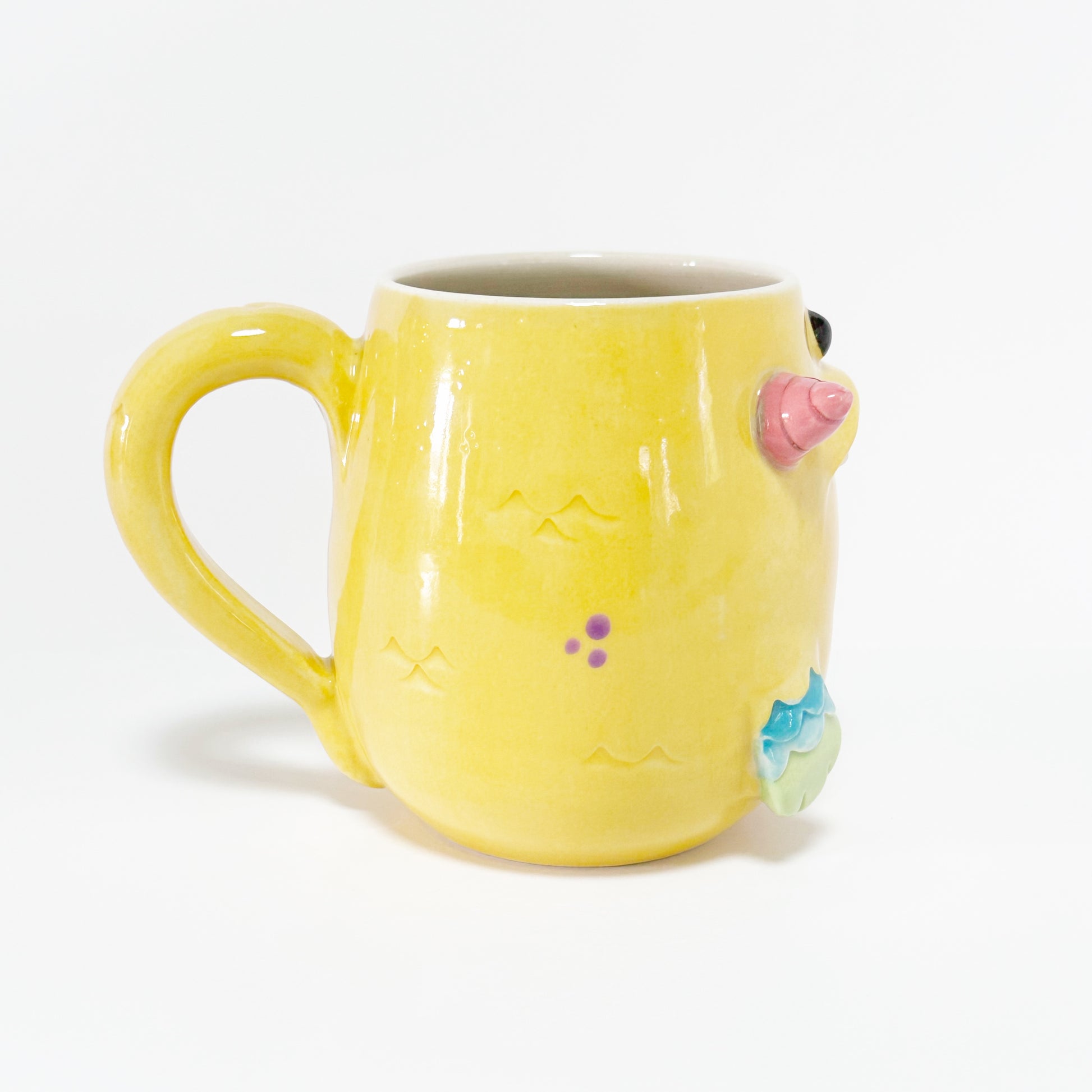 This mug is lovingly created on the wheel and then the features are built on by hand. Since all of our creations are built one at a time, no two are exactly the same. Our products are also hand painted adding to the unique design on every creation. You may be able to see our hands at work in the brush strokes of the glaze. You may also notice some texture in spots. This is part of our handmade quality and the uniqueness to every piece.