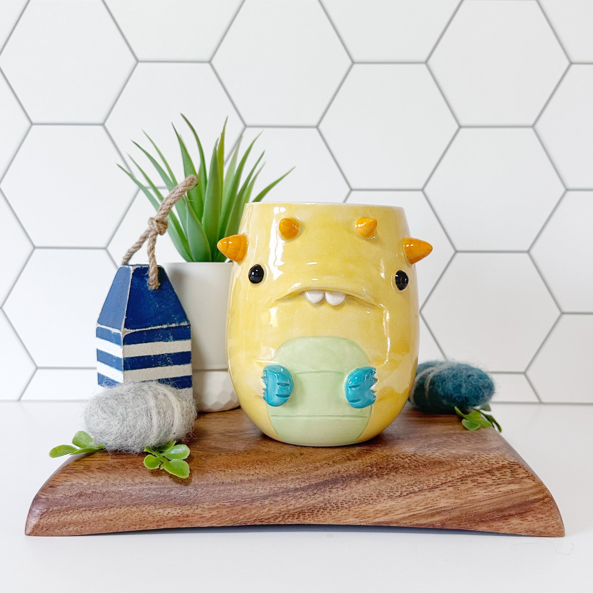This mug is lovingly created on the wheel and then the features are built on by hand. Since all of our creations are built one at a time, no two are exactly the same. Our products are also hand painted adding to the unique design on every creation. You may be able to see our hands at work in the brush strokes of the glaze. You may also notice some texture in spots. This is part of our handmade quality and the uniqueness to every piece.