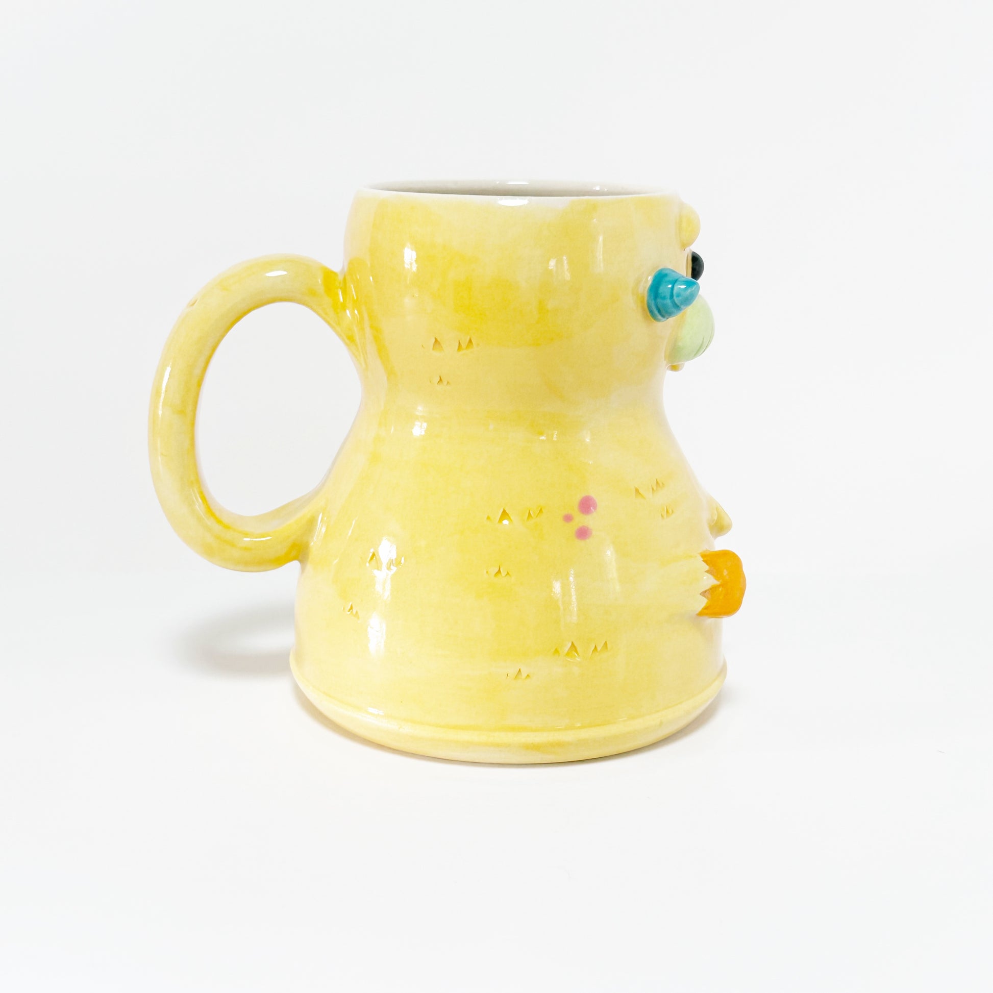 This mug is lovingly created on the wheel and then the features are built on by hand. Since all of our creations are built one at a time, no two are exactly the same. Our products are also hand painted adding to the unique design on every creation. You may be able to see our hands at work in the brush strokes of the glaze. You may also notice some texture in spots. This is part of our handmade quality and the uniqueness to every piece.